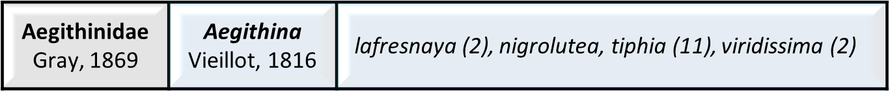 Traditional genus-level classification of extant Aegithinidae following the AviList checklist v2025. (link) The number of subspecies is given in parentheses.