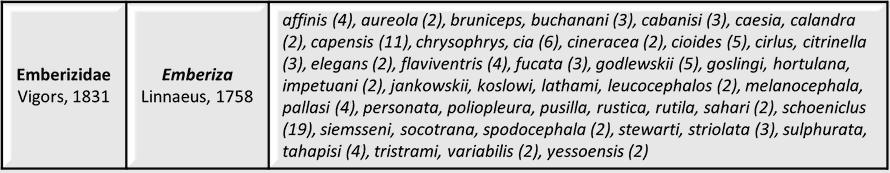 Traditional genus-level classification of extant Emberizidae following the AviList checklist v2025. (link) The number of subspecies is given in parentheses.