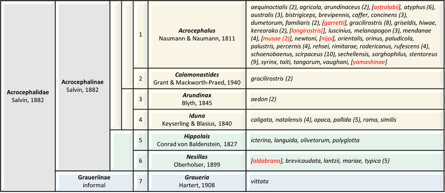Traditional genus-level classification of extant and recently extinct (red letters) Acrocephalidae following the AviList checklist v2025. (link) The number of subspecies is given in parentheses.