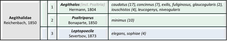 Sun YH (2010), Phylogeny of long-tailed tits and allies inferred from mitochondrial and nuclear markers (Aves: Passeriformes, Aegithalidae), Mol. Phylogenet. Evol.