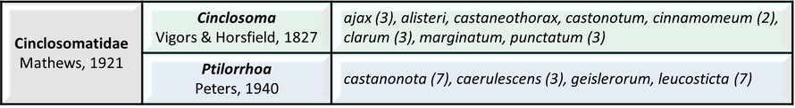 Traditional genus-level classification of extant Cinclosomatidae following the AviList checklist v2025. (link) The number of subspecies is given in parentheses. Note, however, that Ptilorrhoa nigricrissus has been split from P. caerulescens by Blom et al. (2025).