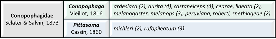 Traditional genus-level classification of extant Conopophagidae following the AviList checklist v2025. (link) The number of subspecies is given in parentheses.