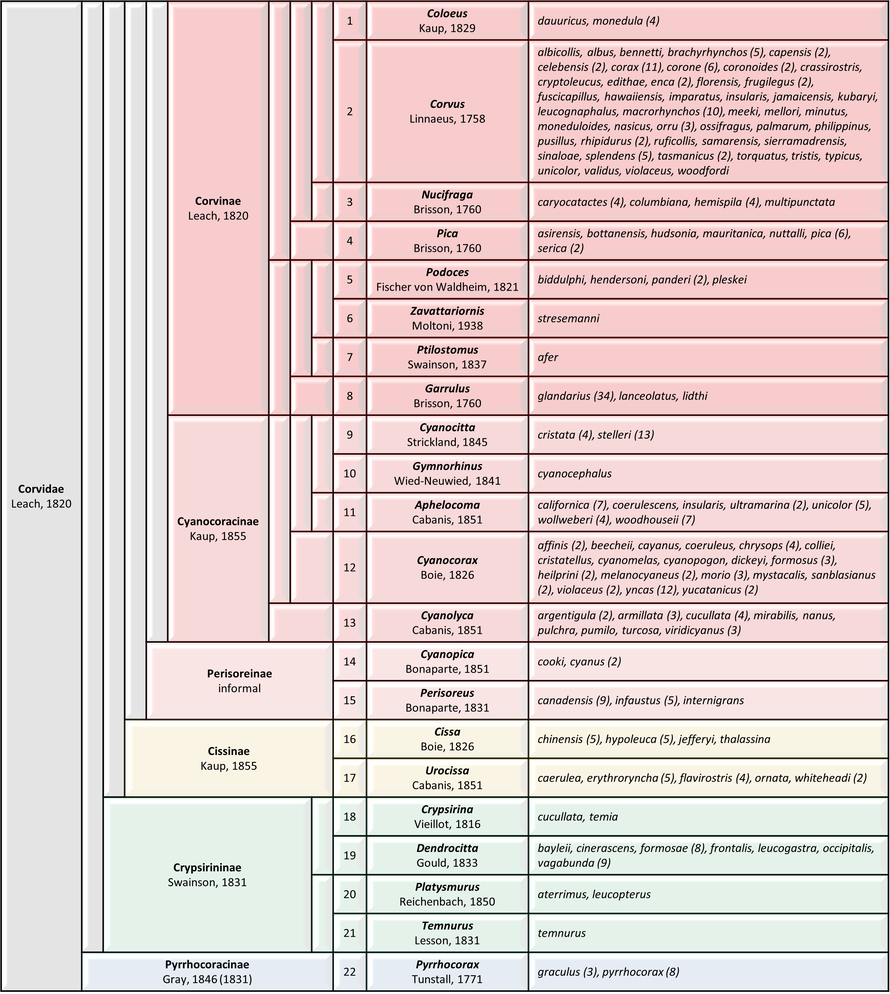 Traditional genus-level classification of extant Corvidae following the AviList checklist v2025. (link) The number of subspecies is given in parentheses.