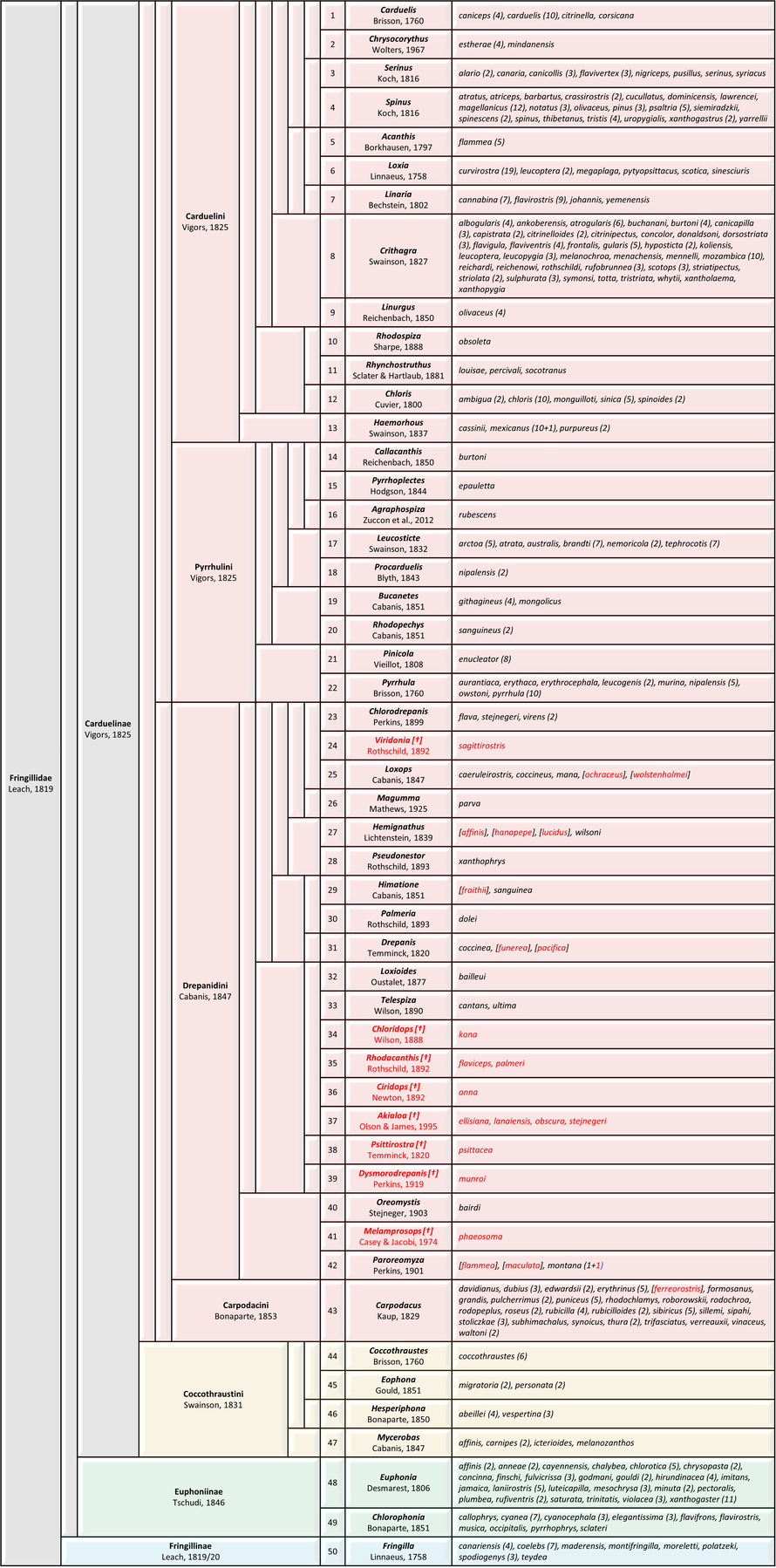Traditional genus-level classification of extant and recently extinct (red letters) Fringillidae following the AviList checklist v2025. (link) The number of subspecies is given in parentheses.