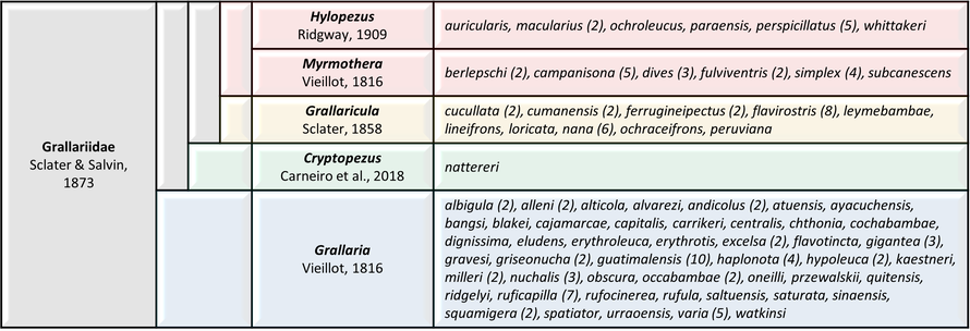 Traditional genus-level classification of extant Grallariidae following the AviList checklist v2025. (link) The number of subspecies is given in parentheses