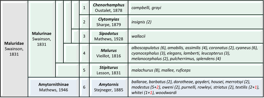 Traditional genus-level classification of extant and recently extinct (red letters) Maluridae following the AviList checklist v2025. (link) The number of subspecies is given in parentheses.