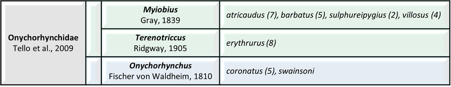 Traditional genus-level classification of extant Onychorhynchidae following the AviList checklist v2025. (link) The number of subspecies is given in parentheses. It should be noted, however, that the genus Onychorhynchus may contain more than two species (Reyes et al., 2023).