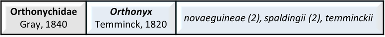 Traditional genus-level classification of extant Orthonychidae following the AviList checklist v2025. (link) The number of subspecies is given in parentheses.