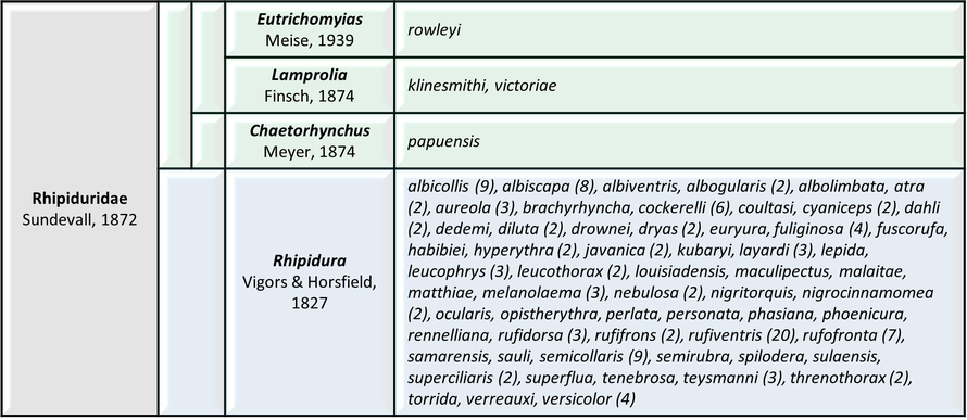 Traditional genus-level classification of extant Rhipiduridae following the AviList checklist v2025. (link) The number of subspecies is given in parentheses.