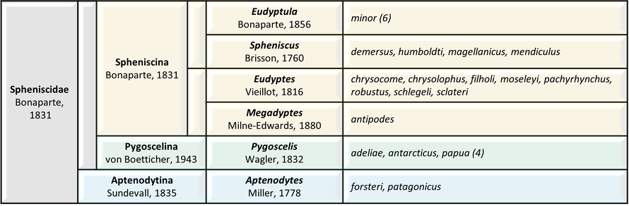 Traditional genus-level classification of extant Sphenisciformes following AviList checklist v2025. (link) The number of subspecies is given in parentheses.