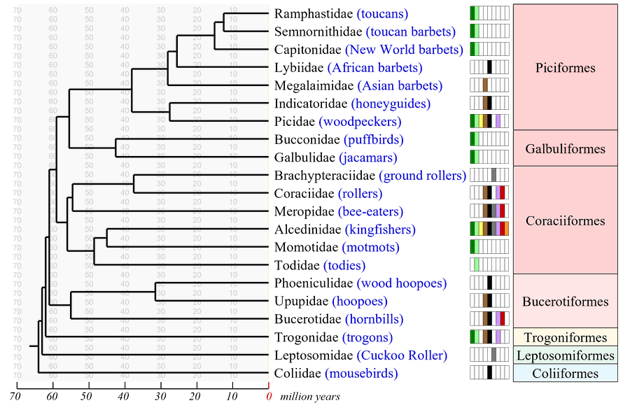 Traditional family-level timetree of extant Coraciimorphae based on Stiller et al. (2024), with the distribution of each family being indicated by the colour-code used throughout this website (Distribution code). [Chronoclassification would unite Capitonidae, Lybiidae, Ramphastidae and Semnornithidae in one family.]