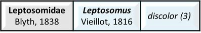 The taxon comprises 1 species, Leptosomusdiscolor, in the family Leptosomidae.