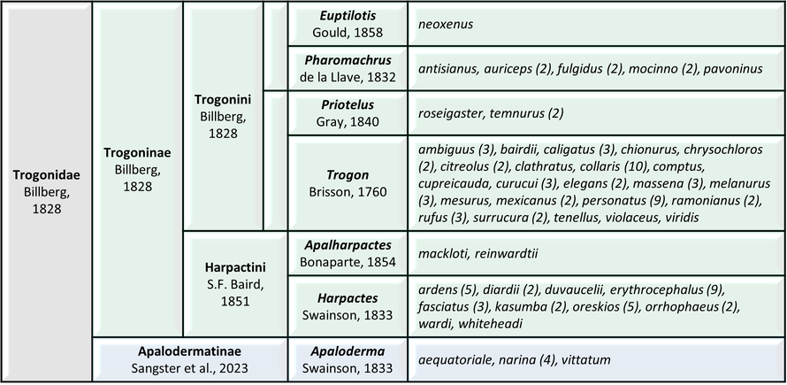 Sangster G, Gregory SMS, and Dickinson EC (2023), Apaladermatinae, a new family-group name for the African trogons (Trogonidae), with clarification of the authorship of Harpactini, Avian Syst. 2, 45-52. (pdf)
